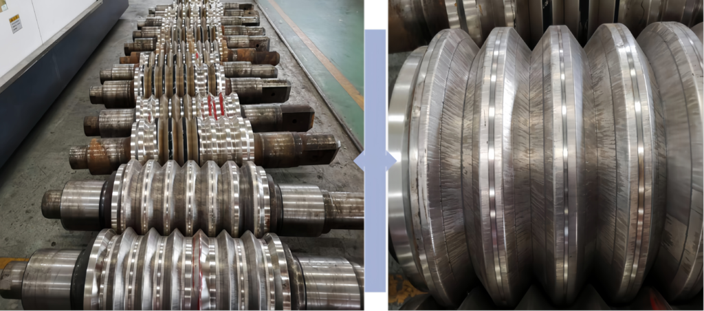 1.1 Applications related to steel rolling roller tables: Alloying treatment for rough and intermediate rolls of high-speed wire rods and bars to extend service life and reduce costs; the surface alloying + cladding overlay for looper wheels of rolling mills extends their service life by more than 2-4 times, reducing usage and production costs; it can repair the damage of roll bearing parts and extend the service life of bar splitting looper wheels, tension leveler rolls, etc.